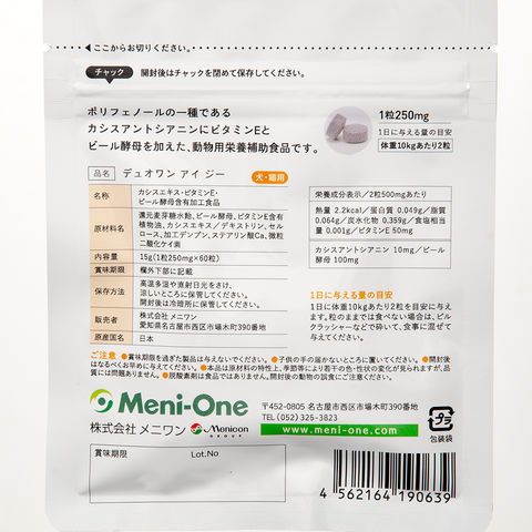 メーカー画像 Duo One Eye G(デュオワンアイジー) 犬猫用 60粒 4562164190639 犬 イヌ 犬用 いぬ用 dog 犬フード 健康補助食品 サプリメント 猫 ネコ 猫用 ねこ用 cat 猫フード 眼 目 瞳 カシスアントシアニン ビタミンE ビール酵母 ポリフェノール 嗜好性 目の健康 眼の健康 錠剤 タブレット 少ない給与量 デュオワン アイ ジー メニワン Meni 国産 日本産 20250204 y25m02 ngtk