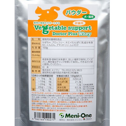 メーカー画像 ベジタブルサポート ドクタープラス ホエイ パウダー 犬猫用 100g 4562164190271 20250111 y25m01 Kbsk 犬猫 犬 いぬ ドッグフード 犬フード 猫 キャットフード 猫フード ねこ 健康 身体 サプリメント 動物用補完食 国産 日本産 肝臓 肝臓用 メニワン 犬猫用栄養補助食品 栄養 栄養補助 栄養補助食品 かぼちゃ ブロッコリー にんじん しいたけ 人参 南瓜 ベジタブル 健康維持 チャック付 粉末 ふりかけ 混ぜる ホエイたんぱく