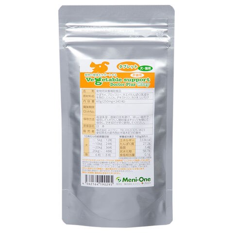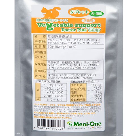 メーカー画像 ベジタブルサポート ドクタープラス ホエイ タブレット 犬猫用 60g(240粒) 4562164190295 20250111 y25m01 Kbsk 犬猫 犬 いぬ ドッグフード 犬フード 猫 ねこ キャットフード 猫フード 健康 身体 サプリメント 動物用補完食 国産 日本産 肝臓 肝臓用 メニワン 犬猫用栄養補助食品 栄養 栄養補助 栄養補助食品 かぼちゃ ブロッコリー にんじん しいたけ 人参 南瓜 ベジタブル 健康維持 チャック付 ホエイたんぱく 錠剤