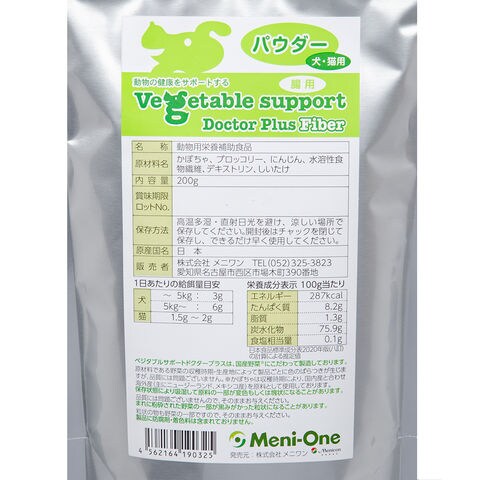 メーカー画像 ベジタブルサポート ドクタープラス ファイバー(腸用) パウダー 犬猫用 200g 4562164190325 20250111 y25m01 Kbsk 犬 いぬ イヌ ドッグフード 犬フード 猫 キャットフード 猫フード ねこ ネコ 健康 身体 サプリメント 動物用補完食 国産 日本産 メニワン 犬猫用栄養補助食品 栄養 栄養補助 栄養補助食品 ファイバー かぼちゃ ブロッコリー にんじん しいたけ 人参 ニンジン カボチャ 南瓜 食物繊維 腸 腸用 ベジタブル 健康維持 チャック付 粉末 ふりかけ 混ぜる 腸内環境