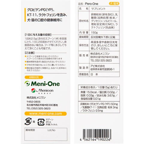 メーカー画像 ペロワン 犬猫用 150g 4562164190226 犬 イヌ いぬ 犬用 いぬ用 dog DOG 犬フード 健康補助食品 サプリメント 猫 ネコ ねこ 猫用 ねこ用 cat CAT 猫フード 健康維持 口 お口 口腔 グロビゲンPG 乳酸菌 KT-11 ラクトフェリン ペースト 嗜好性 メニワン メニわん Meni One 国産 日本産 20250205 y25m02 ngtk