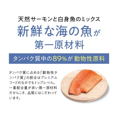 | 保証成分 | タンパク質:34.0%以上、脂質:15.0%以上、粗繊維:5.0%以下、粗灰分:9.0%以下、水分:10.0%以下、 カルシウム:0.90%以上、リン:0.70%以上、マグネシウム:0.08%以上、タウリン:0.15%以上、オメガ6脂肪酸:2.50%以上、オメガ3脂肪酸:0.50%以上、Lーカルニチン:50mg/kg以上 |