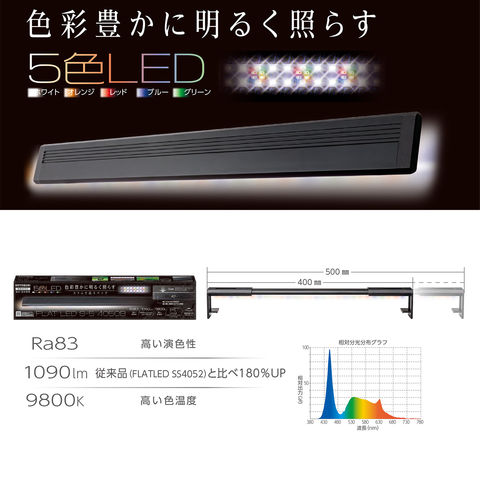 ●5色LEDで色彩豊かに明るく照らす、スリムで高スペックなLEDです。 ●高スペック(高輝度)の白色SMD LEDをメインに配列、更に色彩補正のオレンジ・レッド・ブルー・グリーンLEDを追加しました。 ●スライド式リフトアップパーツ付きです。 ●枠付き、フレームレス水槽どちらにも対応。 ●熱によるLEDの劣化を最小限に抑制するアルミ素材のボディです。 |