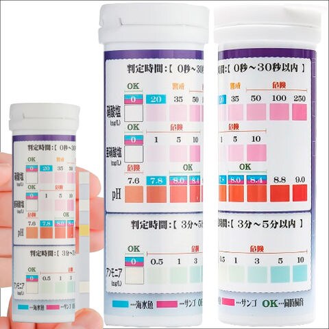 ●1枚の試験紙で4種類の水質、ph、硝酸塩、亜硝酸塩、アンモニアの値が1~3分程度で検査できる水質テストキットです。 ●新しく水槽を立ち上げた場合や、ろ過能力が不十分な場合アンモニアを分解するバクテリアが十分に存在しておらず、アンモニア濃度が急激に上昇してアンモニア中毒を引き起こすケースがあります。 ●このテストキットは、そうした状況での早期検出に役立ちます。 ●また、海水魚やサンゴが好む水質を手軽に確認できる点も特長です。 |