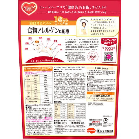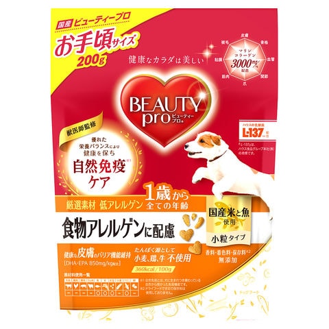 メーカー画像 ドッグフード ビューティープロ ドッグ 食物アレルゲンに配慮 1歳から 200g 4902112009086 20250319 y25m03 mikari 犬 イヌ 犬フード ドライフード 餌 エサ ご飯 ゴハン 小粒 免疫ケア 国産 日本産 お試し コラーゲン グルコサミン コンドロイチン 米 お米 コメ 魚 サカナ 低アレルゲン 低アレルギー 食物アレルギー ドライ フード