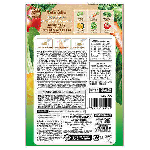 マルカン ナチュラハ グルテンフリー ベジタブルペースト 4906456582021 20250311 y25m03 ktym グルテン フリー ベジタブル 野菜 ペースト 液状 砂糖不使用 糖類不使用 砂糖 糖類 ペースト状 栄養補助食 栄養 補助食 栄養プラス 6種の野菜 6種類 凝縮 小松菜 ビタミンC 人参 にんじん βカロテン ブロッコリー 葉酸 かぼちゃ 南瓜 ビタミンE キャベツ 食物繊維 トマト リコピン トッピング 無添加 無添加フード フード うさぎ 兎 小動物 小動物用おやつ おやつ 間食 保存料不使用 保存料 酸化防止剤 酸化防止剤不使用 着色料不使用 着色料 小分け 栄養強化 合成ビタミン 合成ビタミン配合 linean2503food opa2_choku pasteminimaloyatu