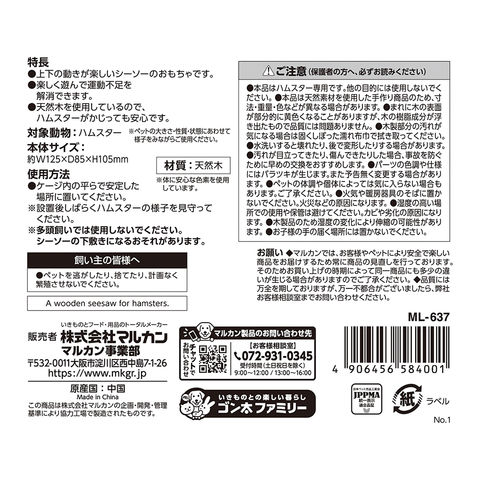 | 特長 | ●上下の動きが楽しい、シーソーのハムスター用のおもちゃです。 ●シーソーにはでこぼこがついており、しっかりとつかみながらのぼることができます。 |