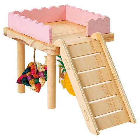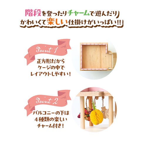 | 特長 | ●ハムスター用のおもちゃです。 ●スロープを使って上にのぼることができます。 ●下のスペースには付属のチャームを吊るして遊ぶことができます。 ●レイアウトしやすい正方形です。 |