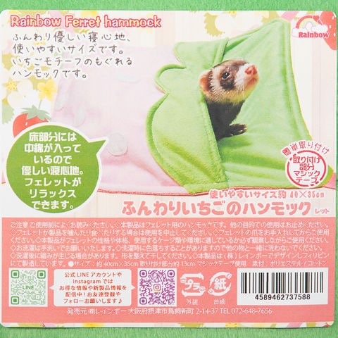 | 特長 | ●ふんわり優しい寝心地の定番サイズで使いやすい、いちごモチーフのもぐれるフェレット用ハンモックです。 ●寝心地抜群です。 ●取り付け部分はマジックテープ使用(折り返した状態)です。 |