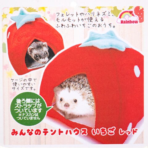 | 特長 | ●フェレットやハリネズミ、モルモットが使えるふわふわのイチゴのおうちです。 ●後ろ側にはケージに固定できるストラップ付(金具はついていません)。 |