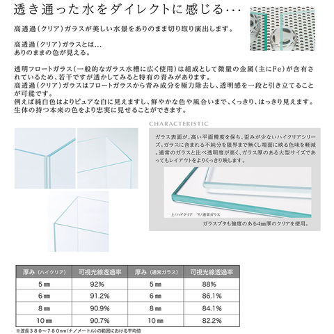 ●透明度が高い、オールガラス水槽です。 ●ガラス表面が、高い平面精度を保ち、歪みが少ないハイクリアシリーズ。 ●ガラスに含まれる不純分を限界まで無くし端面に映る色味を軽減。 ●通常のガラスと比べ透明度が高く、ガラス厚のある大型サイズであってもレイアウトをよりくっきり映します。 ●透き通った水をダイレクトに感じる...高透過(クリア)ガラスが美しい水景をありのまま切り取り演出します。 ●新形状のガラスブタ受けで外観からの存在感は抑えつつ、受け部が長く設置しやすいです。 |