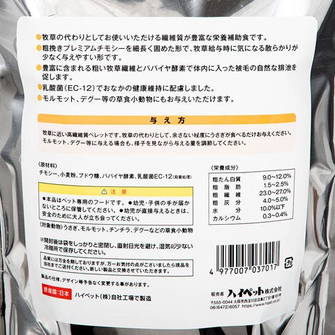 | 原材料 | チモシー、小麦粉、ブドウ糖、パパイヤ酵素、乳酸菌(加熱処理) |