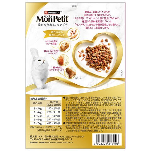 | ご注意 | ※本品は成猫用総合栄養食です。離乳前の幼猫には与えないでください。 ※直射日光や高温多湿を避け、小児の手の届かない涼しく風通しの良い室内・屋内で保管してください。保管の際は虫などが入らないようにご注意ください。 ※開封後は密封して保存し、お早めにお使いください。 |