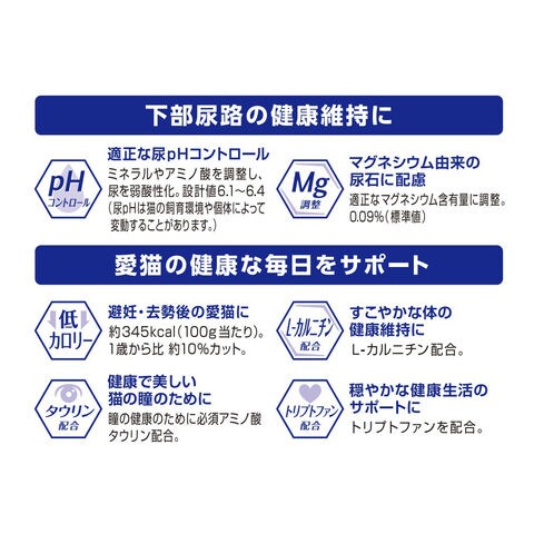 ●猫の臨床栄養学から生まれた下部尿路の健康維持フードです。 ●避妊去勢後の愛猫に配慮しカロリー控えめ(1歳から比約10%カット)。子ねこから与えられる全ライフステージ用です。 ●マグネシウムとカルシウムの適正バランス、尿pHのコントロールなど、成長段階にあった栄養設計をしています。 |