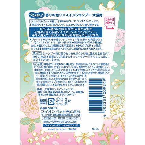 メーカー画像 ライオン ペットキレイ 香りの泡リンスインシャンプー 500ml 犬猫用 フローラルブーケの香り 4903351009349 20250414 y25m04 Kbsk 犬猫用品 犬猫 犬 犬用品 ドッグ 猫 猫用品 キャット いぬ イヌ ねこ ネコ お風呂用品 お風呂 バス用品 お手入れ シャンプー リンス リンスインシャンプー フローラルブーケ ボディケア 洗う 泡 ふんわり なめらか 手軽 汚れ ニオイ 臭い シルクプロテイン 華やか 低刺激 日本製 国産