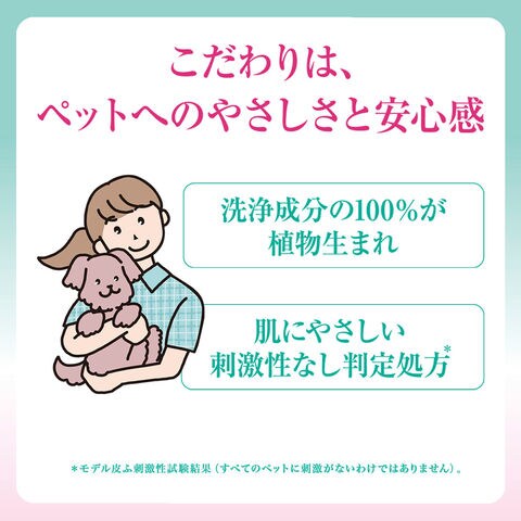 | 特長 | ●手早く洗えて、ふんわりなめらかな被毛に仕上げる犬猫用のリンスインシャンプーです。 ●きめ細かいクリーミィな泡で、肌への負担も少なく手軽にシャンプーできます。 ●汚れ・ニオイをスッキリ落とします。 ●洗浄成分の100%が植物生まれです。 ●肌にやさしい刺激性なし判定処方*1です。 ●シルクプロテイン配合、華やかなフローラルブーケの香りです。 *1.モデル皮ふ刺激性試験結果(すべてのペットに刺激がないわけではありません)。 |