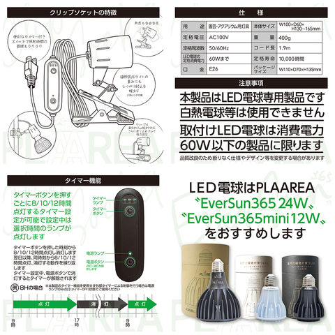 ●口金E26型対応の多機能でおしゃれな灯具です。 ●照明角度を自由に変えられる二関節アームです。 ●クリップ部のすべり止めゴムで強力固定可能です。 ●便利なタイマースイッチ付き(8、10、12時間)です。 ●EverSun365シリーズと相性抜群です。 |