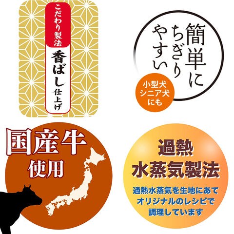 特長 ●国産牛を香ばしく焼き、食欲そそるおいしさに仕上げた犬用おやつです。