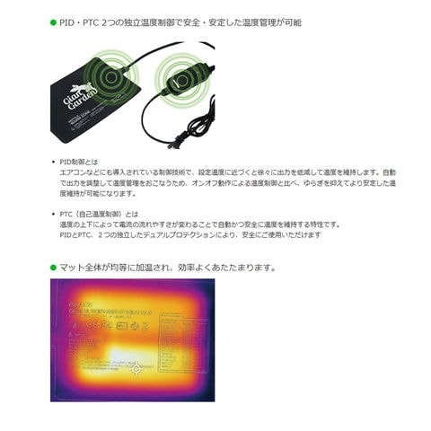 ●PID制御による安定した温度管理が可能なパネルヒーターです。 ●PID制御とは、設定温度に近づくと、徐々に出力を低減して温度を維持します。オンオフ動作のある保温器具での温度管理と比べ、より安定した温度維持が可能になります。 ●温度の上下によって電流の流れやすさが変わることで自動かつ安全に温度を維持するPTC制御も備えています。PIDとPTCの2つの独立したデュアルプロテクションにより、安全にご使用いただけます ●均等な加温によってっマット全体が効率よくあたたまります。 ●デジタル表示で簡単に操作できます。20~45℃の範囲で1℃単位の温度設定が可能です。 ●光センサーが室内の光を感知し、真っ暗な環境では設定温度を2℃下げるモードを搭載しています。 ●マットと同サイズの断熱シートが1枚付いています。使用環境に応じて付属の両面テープで貼り付けてご使用ください。 |