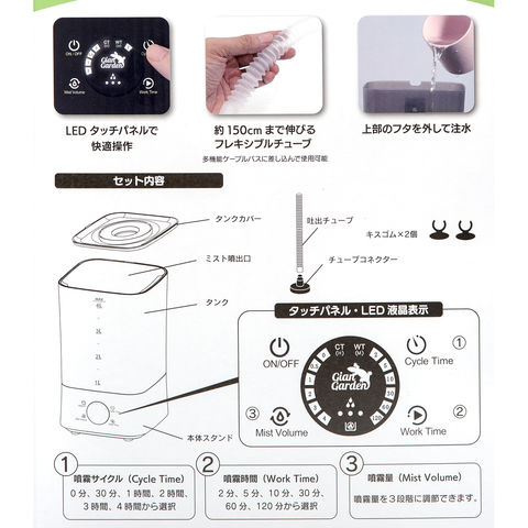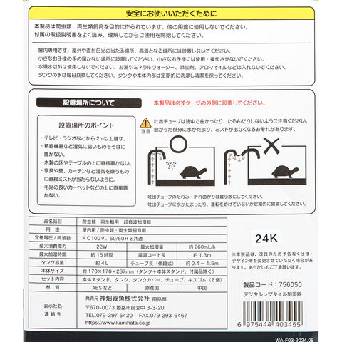 | ご注意 | ※本品は両生類・爬虫類飼育用超音波加湿器です。目的以外の用途では使用しないでください。 |