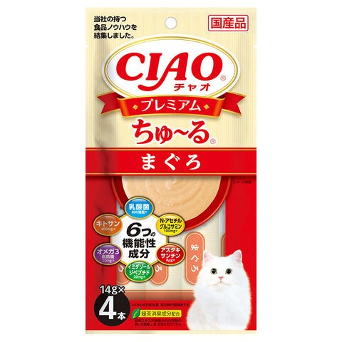 メーカー画像 CIAO プレミアムちゅ~る まぐろ 14g×4本 4901133503115 猫 ねこ キャット cat チャオ 猫用 ねこ用 猫フード キャットフード 猫餌 猫えさ おやつ トリーツ 間食 猫おやつ ペースト 液状 液体 レトルト ウェットフード ウエットフード ちゅ~る ちゅーる お腹 皮膚 被毛 関節 眼 健康維持 健康に配慮 フン 糞 消臭 乳酸菌 キトサン 食物繊維 オメガ3脂肪酸 DHA EPA グルコサミン アスタキサンチン イミダゾールジペプチド 無着色 無香料 化学調味料不使用 国産 日本産 緑茶消臭成分 0250417 y25m04 ngtk 25raf_c_ib1 25raf_c0