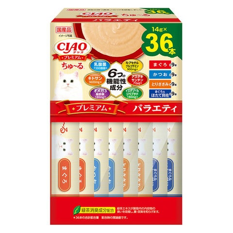 メーカー画像 CIAO プレミアムちゅ~る BOX バラエティ 14g×36本 4901133613333 猫 ねこ ネコ キャット cat CAT チャオ ちゃお 猫用 ねこ用 猫フード キャットフード 猫餌 猫えさ きゃっとふーど おやつ オヤツ トリーツ 間食 猫おやつ ペースト 液状 液体 レトルト ウェットフード ウエットフード ちゅ~る ちゅーる チュール 機能性成分 お腹 おなか フン臭 ふん 糞 皮膚 被毛 関節 目 眼 健康維持 乳酸菌 キトサン オメガ3 グルコサミン アスタキサンチン イミダゾールジペプチド まぐろ マグロ かつお カツオ とりささみ とりササミ ささみ ササミ ほたて ホタテ 国産 日本産 緑茶消臭成分 バラエティ バラエティパック アソート 箱入り 大容量 20250415 y25m04 ngtk