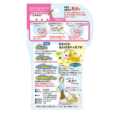 | 特長 | ●お出かけ時に嫌な虫からペットを守る、約140日間の虫よけです。 ※風向き、使用環境により十分な効果が得られない場合があります。 ●散歩の時にリード・ハーネスの金具につけるだけなので簡単です。(背中側に装着してください。) ●火・電池いらずでペットが嫌がりません。 ●ピレスロイド(有効成分)で虫よけします。 |