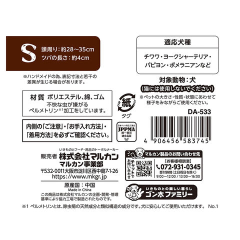 | ご注意 | ※本品は犬用の帽子です。目的以外の用途では使用しないでください。 ※猫には使用しないでください。 ※漂白剤などの薬品、熱湯は使用しないでください。 ※火気のそばでのご使用や保管はしないでください。また、直射日光、高温多湿の場所を避けて保管してください。 ※縫製品のためサイズに若干の違いが生じる場合があります。 ※ペットの大きさ、性質、状態にあわせて様子をみながらご使用ください。 |
