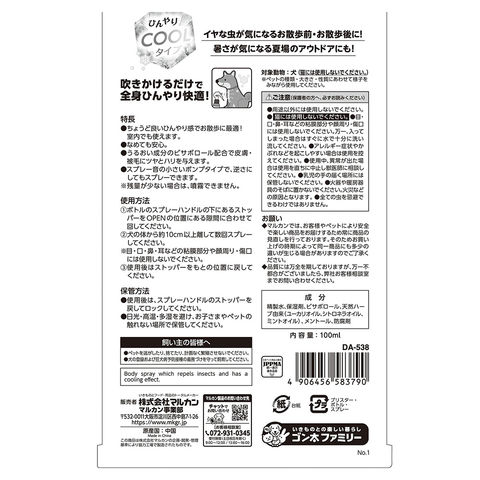 メーカー画像 マルカン 虫よけ ボディスプレー クールタイプ 4906456583790 20250402 y25m04 ktym 虫 よけ ボディ スプレー クール タイプ 冷感 ひんやり おさんぽ前 お散歩前 お散歩 散歩 ノンアルコール 天然由来成分 天然由来 なめても安心 吹きかける 100ml 不快害虫 不快害虫用 お散歩後 夏場 夏 アウトドア 全身ひんやり いぬ 犬 イヌ ドッグ DOG 愛犬 いぬ用品 イヌ用品 犬用品 用品 室内 室外 うるおい 虫除け 防虫 虫よけスプレー 防虫スプレー 虫除けスプレー