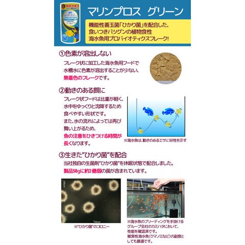 特長 ●機能性善玉菌「ひかり菌」を配合した、食いつきバツグンの海水魚用フレークです。