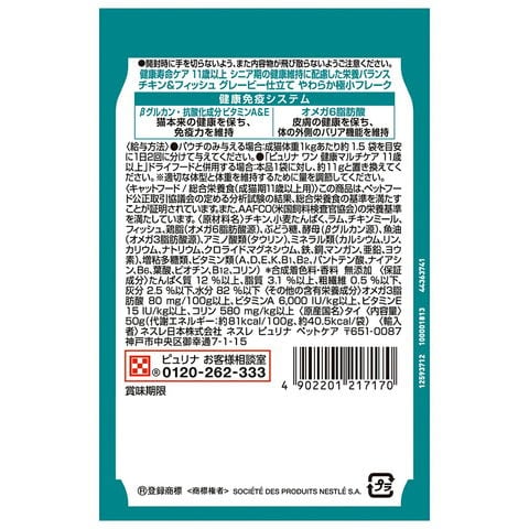 | 特長 | ●やわらか極小フレークで食べやすい、グレービー仕立てのシニア猫ちゃん用総合栄養食です。 ●11歳以上の猫の健康維持に配慮し脳や腎臓、尿路の健康維持をサポートします。 ●「健康免疫システム」で猫本来の免疫力を維持します。 |