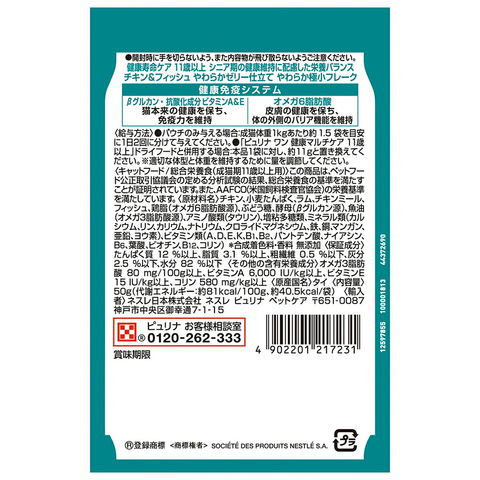| 与え方 | ●パウチのみ与える場合:成猫体重1kgあたり約1.5袋を目安に1日2回に分けて与えてください。 ●「ピュリナワン健康マルチケア11歳以上」ドライフードと併用する場合:本品1袋に対し、約11gと置き換えてください。 ※適切な体型と体重を維持するために量を調節してください。 |