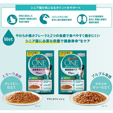 メーカー画像 ピュリナワン パウチ 健康寿命ケア 11歳以上 チキン&フィッシュ ゼリー仕立て 50g 4902201217231 猫フード キャットフード キャット 猫 ねこ ネコ 健康 免疫 サポート オメガ6脂肪酸 ビタミンE コリン 無添加 総合栄養食 寿命 年齢 11才 高齢 シニア シニア猫 シニア期 老猫 腎臓 尿路 やわらか 極小 フレーク チキン 鶏 鶏肉 鳥 フィッシュ ゼリー 皮膚 餌 えさ エサ ご飯 ごはん ゴハン cpn2503pw cpn24pc1cp 20250407 TISK y25m04 複数売り まとめ売り まとめ買い ケース売り 箱売り 箱買い cpn2508po