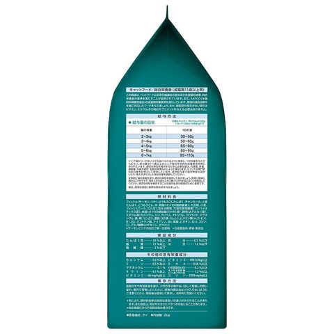 | ご注意 | ※本品はシニア猫用総合栄養食です。離乳前の幼猫には与えないでください。 ※直射日光や高温多湿を避け、小児の手の届かない涼しく風通しの良い室内・屋内で保管してください。保管の際は虫などが入らないようにご注意ください。開封後は密封して保存し、お早めにお使いください。 |