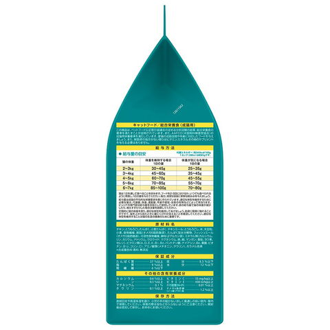 | ご注意 | ※本品は成猫用総合栄養食です。離乳前の幼猫には与えないでください。 ※直射日光や高温多湿を避け、小児の手の届かない涼しく風通しの良い室内・屋内で保管してください。保管の際は虫などが入らないようにご注意ください。開封後は密封して保存し、お早めにお使いください。 |