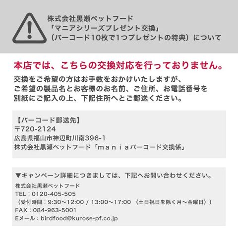 | ご注意 | ※本品は小鳥用フードです。小鳥以外の生き物に与えないでください。 ※乳幼児があやまって食べないように保管には注意してください。 ※本品は十分に精選してあります。ごくまれに、原料由来の外皮など、除去しきれないものが残ることもありますが品質には問題ございません。 ※バーコードを10枚集めてプレゼントのキャンペーンは当店では行っておりません。あらかじめご了承くださいませ。 |