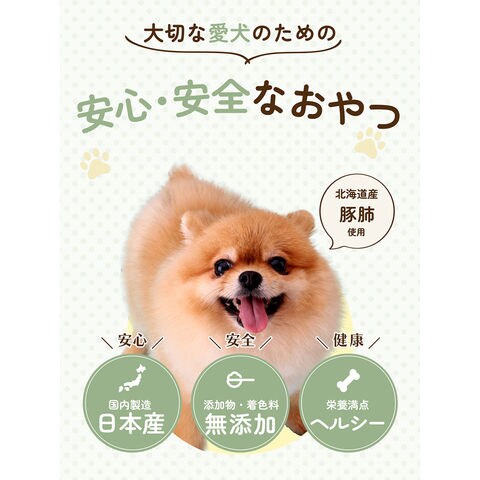 | ご注意 | ※生後6ヶ月未満の幼犬には与えないでください。 ※手作りのため、色、形、匂い、硬さに若干の違いがありますが、品質には問題ございません。 |