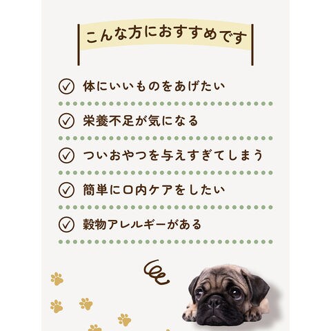 | ご注意 | ※生後6ヶ月未満の幼犬には与えないでください。 ※手作りのため、色、形、匂い、硬さに若干の違いがありますが、品質には問題ございません。 |