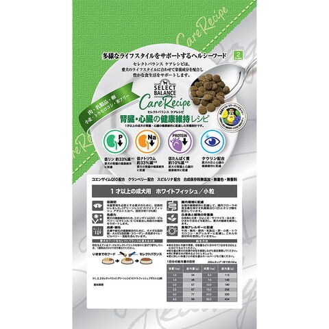 メーカー画像 セレクトバランス ケアレシピ ホワイトフィッシュ 小粒 腎臓・心臓の健康維持レシピ 1才以上の成犬用 800g ドッグフード 4541851004329 犬 いぬ 犬フード 犬用フード ドライフード 腎臓 心臓 皮膚 被毛 腸内環境 お腹 食物アレルギーに配慮 成犬 国産 白身魚 低脂肪 低リン 低ナトリウム タウリン 小麦不使用 肉不使用 合成保存料無添加 無着色 無香料 20250424 y25m04 ngtk gs ドライ フード