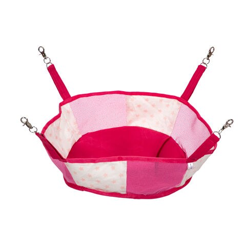 | 特長 | ●フェレット用のハンモックです。 ●夏らしいビビットカラーと星柄のコットンを組み合わせました。 ●丈夫で通気性のいいメッシュサークルです。 ●取り付け部分はナスカンです。 |