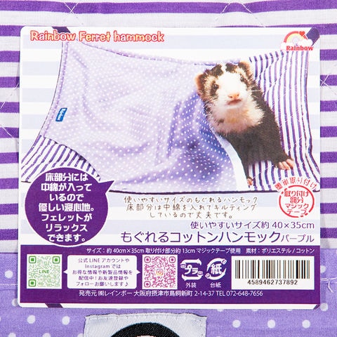 メーカー画像 レインボー もぐれるコットンハンモック パープル 4589462737892 20250430 y25m04 ktym もぐれる 潜れる 潜る もぐる コットン コットン素材 ハンモック 使いやすいサイズ サイズ 使いやすい 中綿 キルティング 優しい 寝心地 リラックス 紫色 紫 マジックテープ 取り付け部分 とりつけ部分 取り付け 取付 とりつけ 簡単取り付け 簡単 かんたん カンタン フェレット ペット 小動物 animal アニマル フェレットグッズ グッズ 小動物用品 用品 あったらいいな 実用性 吊るす 吊り下げ