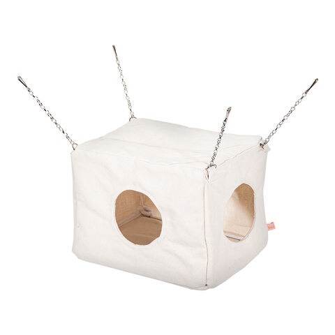 | 特長 | ●小動物用のハウスです。 ●小動物が落ち着ける長方形ハウスです。 ●底板入りでしっかり安定しています。洗濯の際には裏側下部より取り出せます。 ●小動物が使ってくれない場合や寒い季節は、ブランケットやスウェット等、爪の引っかかりにくい素材の布を入れてあげると使いやすくなります。 ●取り付け部分はチェーンです。 |