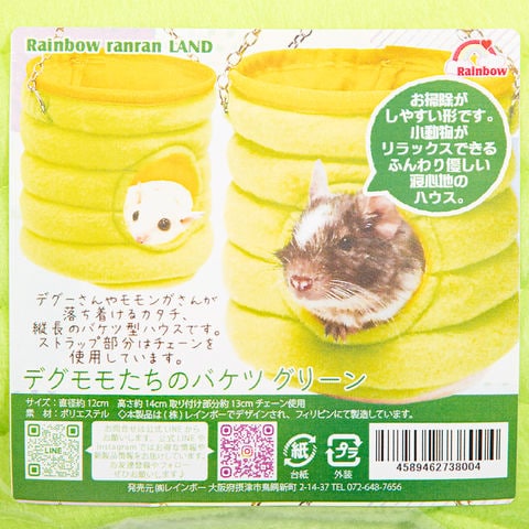 メーカー画像 レインボー デグモモたちのバケツ グリーン 4589462738004 20250506 y25m04 ktym デグー フクロモモンガ モモンガ バケツ 緑 緑色 ハウス ハンモック 落ち着く 落ち着ける 縦長 バケツ型 家 ストラップ チェーン お掃除しやすい 掃除 リラックス ふんわり 優しい 寝心地 ゆらゆらポスト ゆらゆら 耐久性 ペット 小動物 animal アニマル グッズ 小動物用品 用品 あったらいいな 実用性 取り付け部分 とりつけ部分 取り付け 取付 とりつけ 簡単取り付け 簡単 かんたん 吊るす 吊り下げる 吊り下げ式