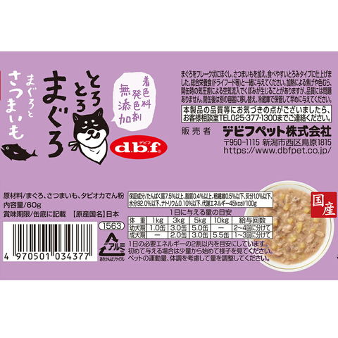 メーカー画像 デビフ とろとろまぐろ まぐろとさつまいも 60g ×24 缶詰 犬 ウェットフード ドッグフード 4970501034377 2250003209940 20250416 y25m04 ktym 犬 いぬ イヌ 犬フード 鮪 マグロ 無添加 国産 日本産 栄養補完食 栄養補助食 フレーク とろみ 水分補給 ウエット ウェット 薩摩芋 サツマイモ さつま芋 サツマ芋 さつまいも ドッグ フード DOG まぐろ さかな 魚 フィッシュ いも 芋 栄養 ウエットフード 複数売り とろとろ トロトロ 愛犬 ケース売り 箱売り