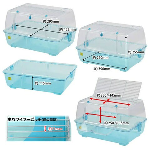 【ルーミィ ブルー】 外寸:幅47.0×奥行き32.0×高さ27.5cm ケージ内部空間:幅39.0×奥行き26.0×高さ25.5cm ケージ内部空間最大:幅42.5×奥行き29.5cm ベーストレイ高さ:11.5cm 天井扉:幅35.0×奥行き14.5mm(中心計測) 前面扉:幅25.0×奥行き11.5mm(中心計測) ワイヤーピッチ間隔:1.1cm ロック部分左右:1.0cm 【プチレット ハムスター用トイレ】 外寸:幅15.0×奥行き9.5×高さ9.0cm |