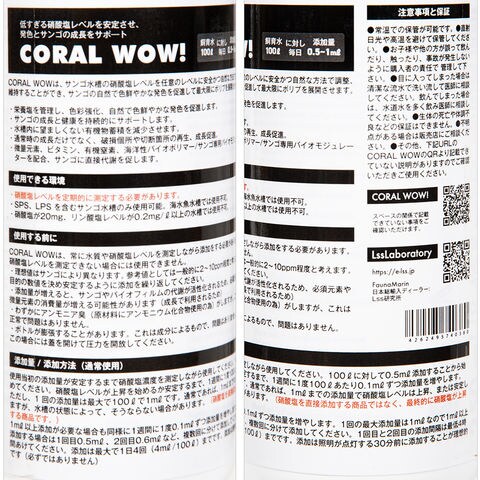 | ご注意 | ※本品はSPS、LPSを含むサンゴ水槽用です。目的以外の用途では使用しないでください。 ※本製品の使用に伴う、生体の死亡や体調不良などの保証はできません。 ※本製品を誤って飲んだりしないように管理、保管してください。 |