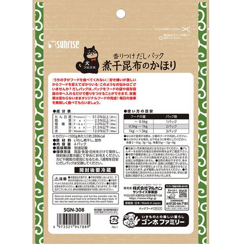 | サンライズ 犬ソムリエ 香りつけだしパック 煮干昆布のかほり 約8g×4パック | |