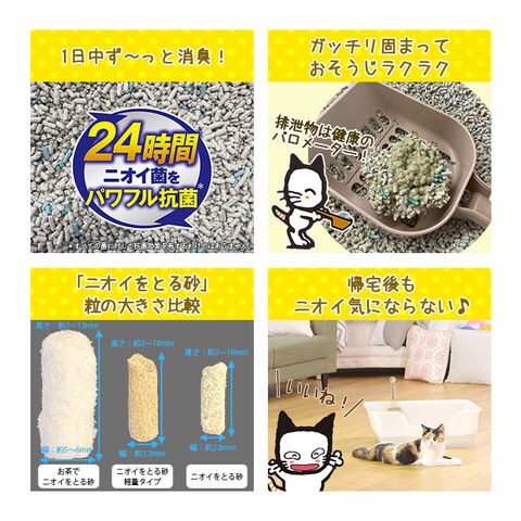 | 特長 | ●固化力と消臭力に優れた猫砂です。ガッチリ固めて帰宅後までずっと消臭します。 ●消臭・抗菌力が従来品よりパワーアップしました。24時間ニオイ菌の増殖を抑制し、トイレを清潔に保ちます。 ●消臭・抗菌剤がオシッコやウンチのイヤなニオイを瞬間強力消臭します。 ●さらに時間と共に発生する、ツンとくるアンモニア臭も長時間抑制します。 ●粉が舞いにくく、ガッチリ固めてくずれにくいから、トイレのお手入れもラクラクです。 |
