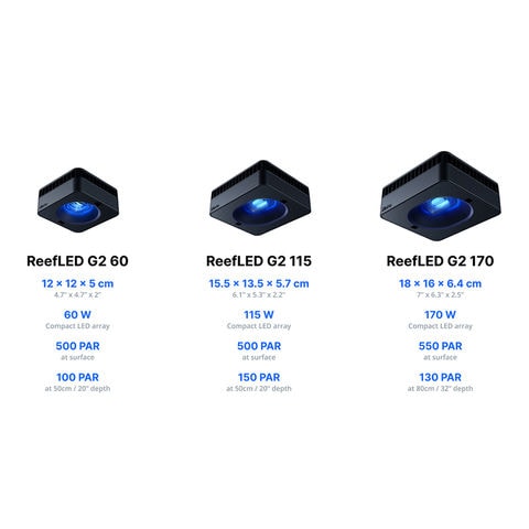 コンパクトLEDアレイ出力(8,000~23,000K)消費電力:170W ムーンライト消費電力:3W PAR値(水面):550μmol/m2/sec PAR値(水深50cm):160μmol/m2/sec PAR値(水深80cm):130μmol/m2/sec 照射範囲:80×80cm 推奨最大設置間隔:75cm 水面との距離(レッドシーのマウンティングシステム不使用時):31cm ※PUR/PAR値は、ReeFLEDの中心の真下で水面直下のポイントで計測 |