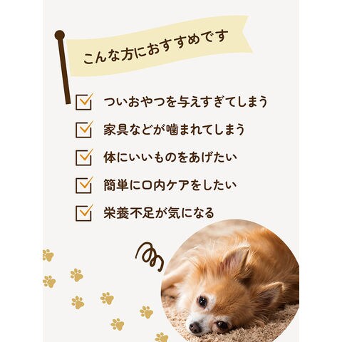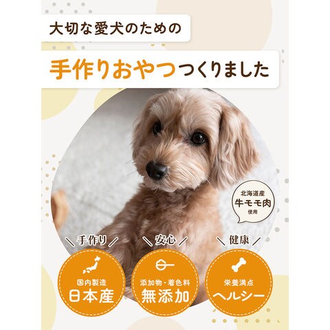 | 注意 | ※生後6ヶ月未満の幼犬には与えないでください。 ※手作りのため、色、形、匂い、硬さに若干の違いがあります。肉由来の脂肪分や血液の固まりや染みが残っている場合がありますが、品質には問題なくむしろ旨味となりますので、安心してお与え下さい。 |